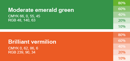 MAIN COLOR : Moderate emerald green, Brilliant vermilion